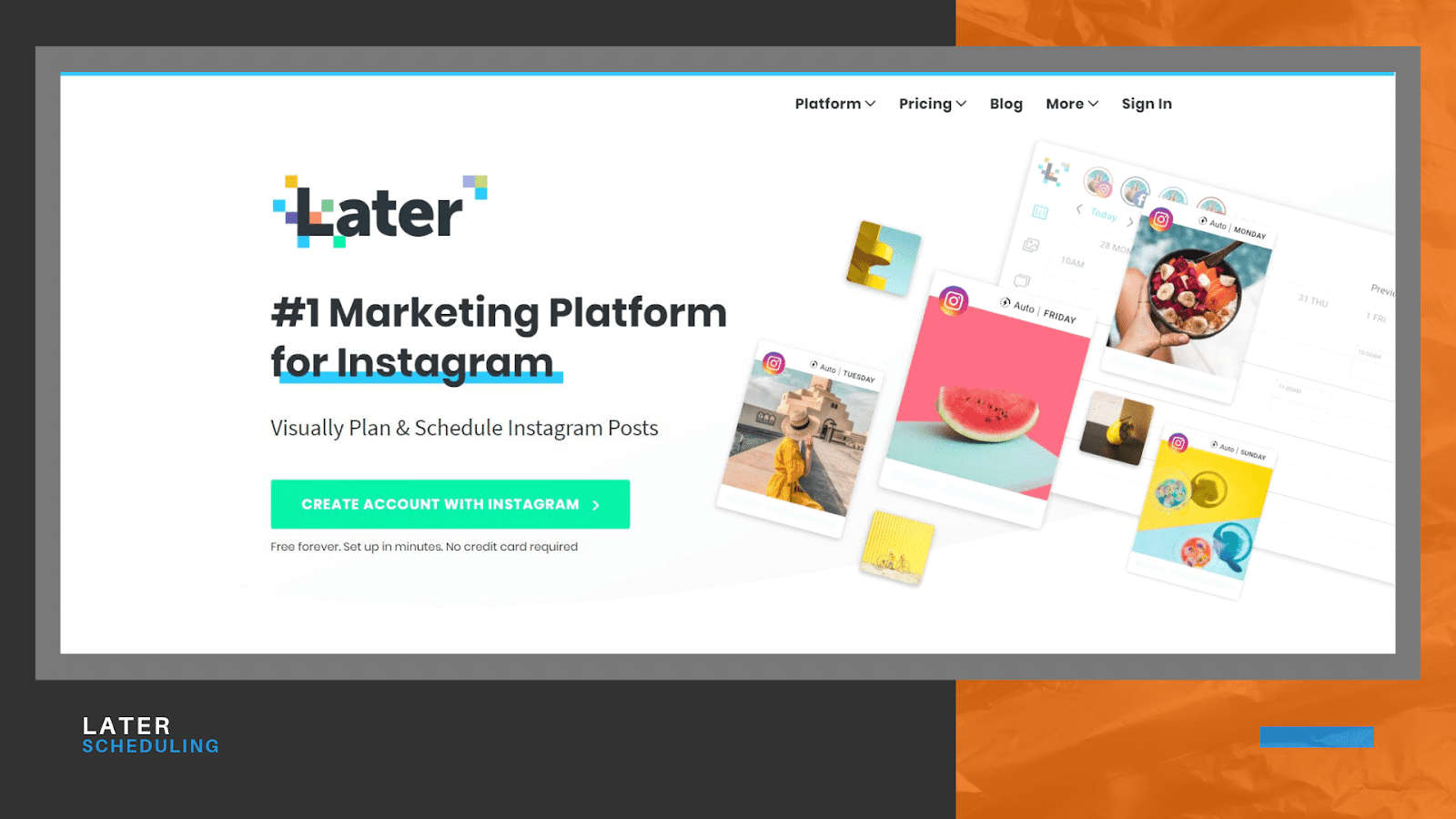 Later is an Instagram scheduler and marketing platform that also allows you to schedule posts visually. Like Planoly, it has auto-publishing features so you can schedule several posts in one day and just sit back and relax while they are published on schedule.
