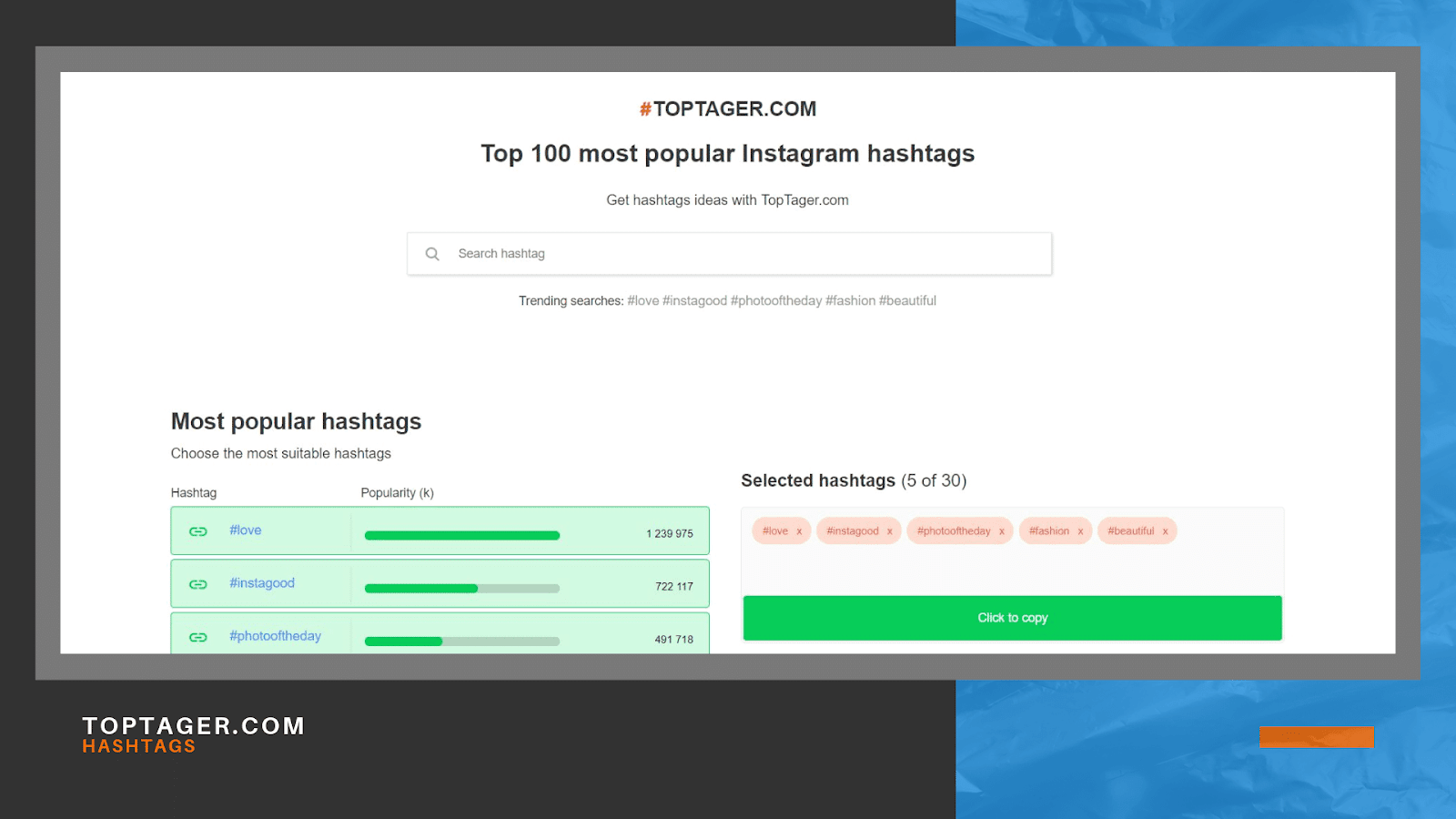 Toptager.com is one of the simplest but most useful apps for targeting hashtags. Toptager.com shows you a list of the most popular hashtags on Instagram and provides you with a search bar that you can use to search for a tag. After searching, Toptager will show you a list of the most relevant hashtags along with a list of the best-suggested hashtags for you to use. It even has an easy “click to copy” function so you don’t have to type in your chosen tags one by one.