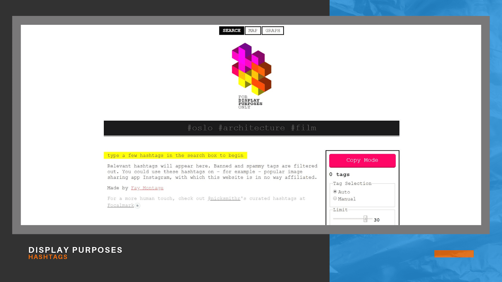Can’t seem to think of the most appropriate hashtags to target for your posts? Display Purposes can help you with that. With Display Purposes, you can type in a hashtag you’re planning to target on their search bar and other relevant hashtags will show up. What’s more, they filter out banned or spammy tags from the results, so you don’t have to worry about your content showing up on the wrong tags.