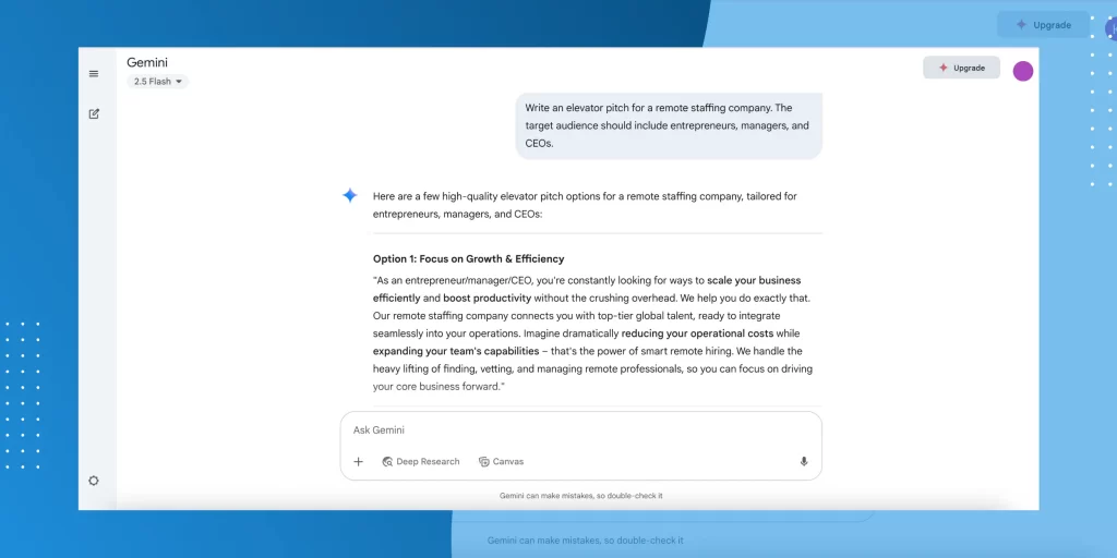 Gemini is Google’s AI assistant and Bard’s successor. As the tech giant’s flagship tool, Gemini is deeply integrated with Google Workspace, making it a strong choice for remote professionals working with Gmail, Docs, Sheets, and so on.