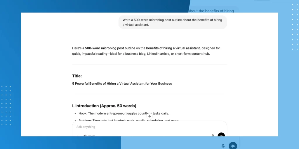 Prompt: Write a 500-word microblog post outline about the benefits of hiring a virtual assistant.