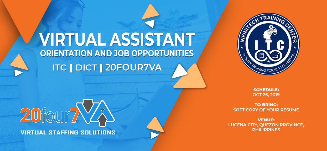 Passers of these training programs are welcome to join the event that ITC will hold on October 26, 2019, the Virtual Assistant Orientation and Job Opportunities event. Aside from passers of the DITC training programs, this event is also open to anyone who wishes to submit their resume to apply to 20four7VA.